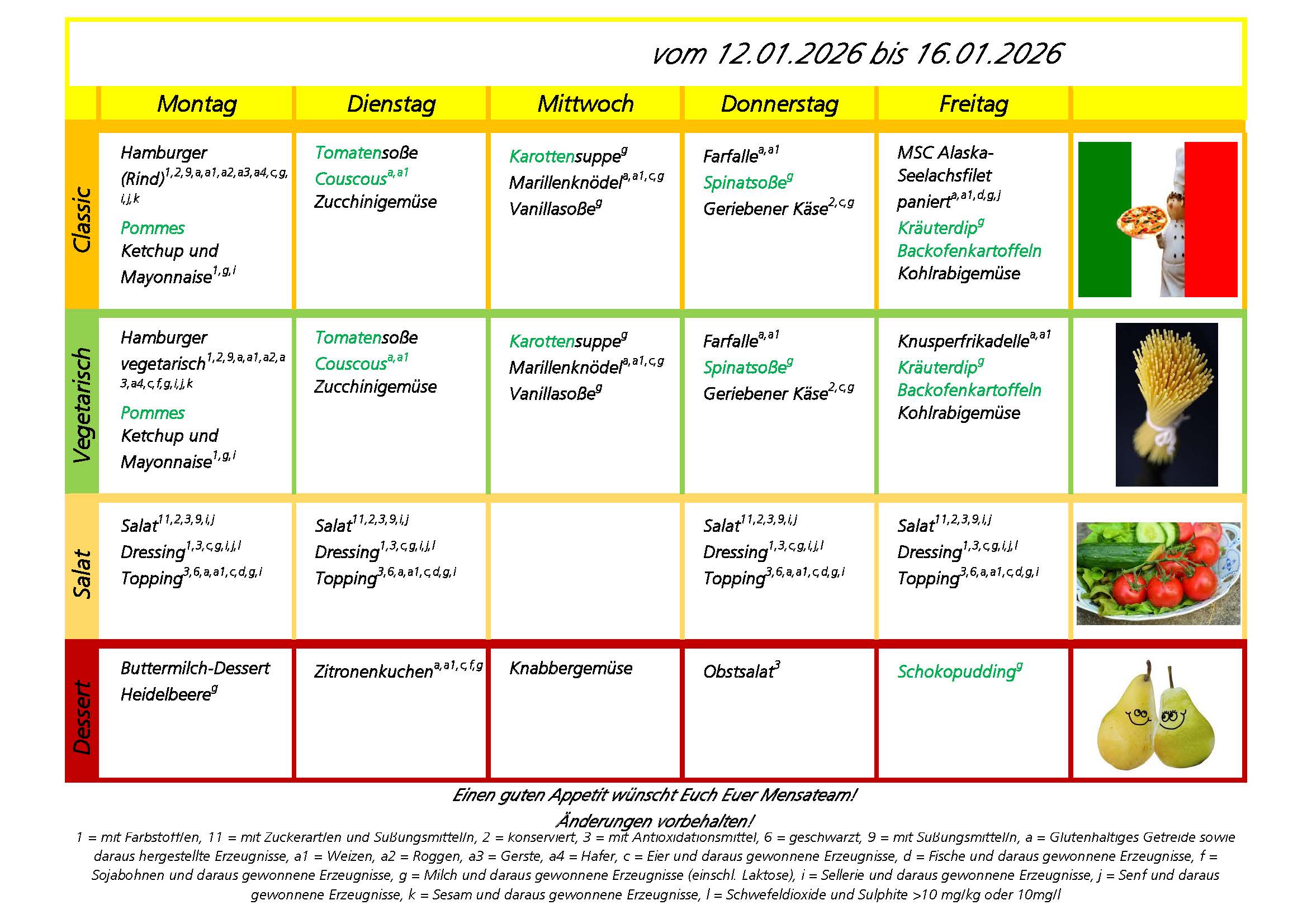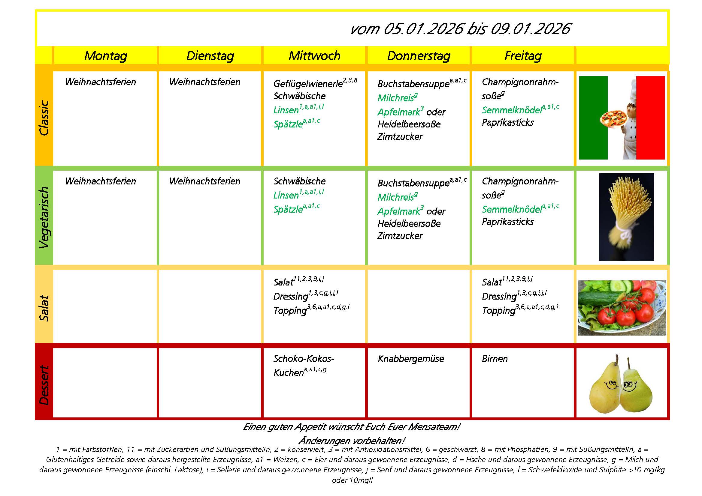 Speisepläne für die kommenden Wochen. Ein leerer Plan bedeutet, dass die Mensa ihre Menüs anhand der eigenen Vorräte selbst auswählt. Es gibt an den Tagen trotzdem Mittagessen, jedoch ohne Vorabinformation über die Menüs.