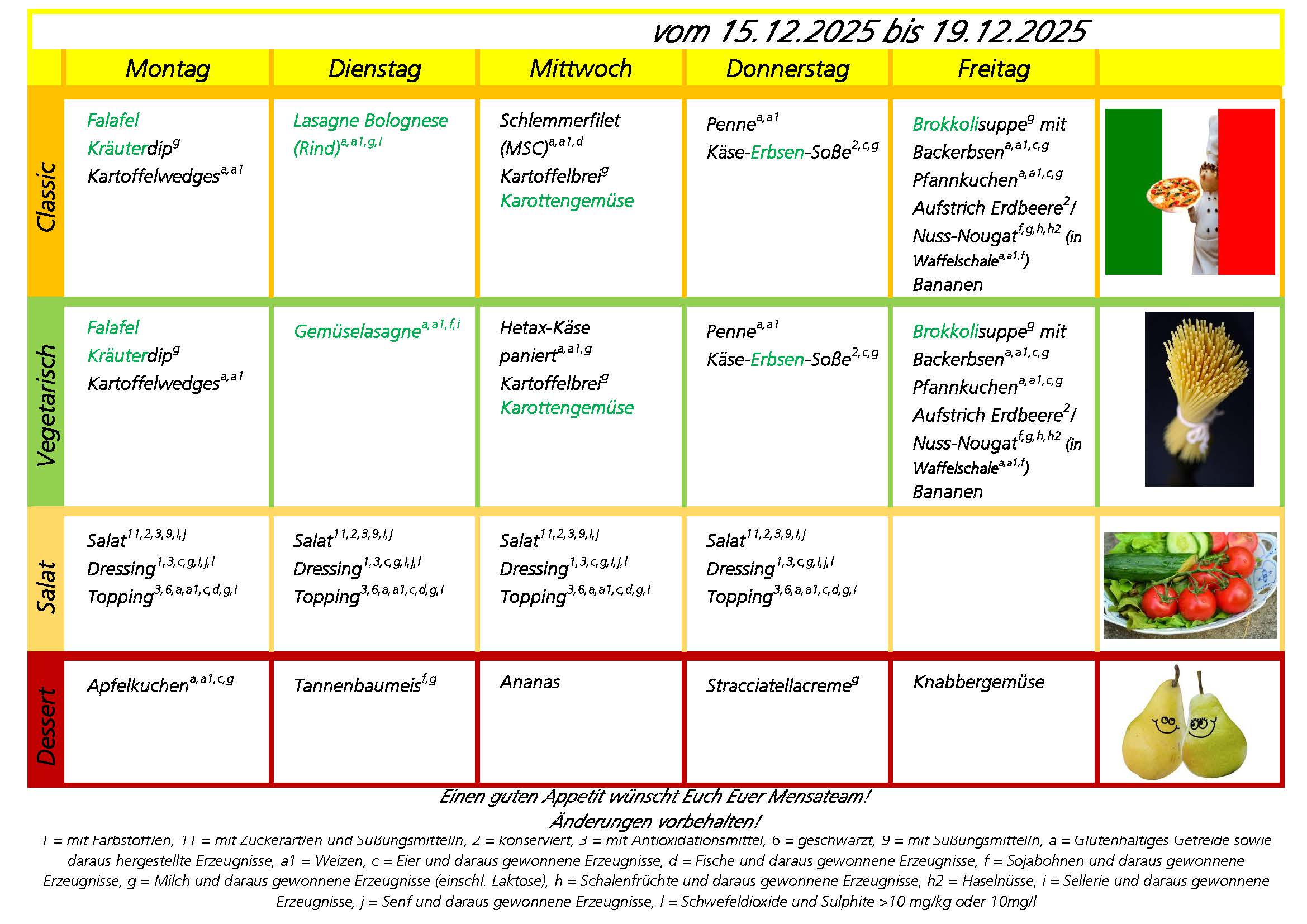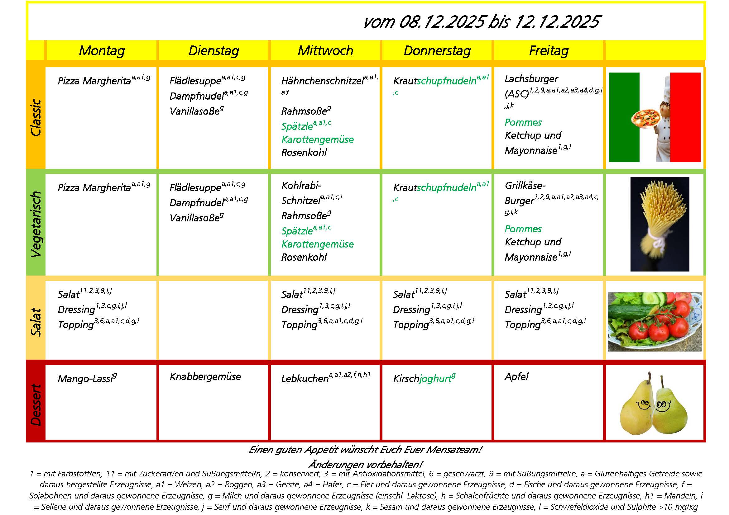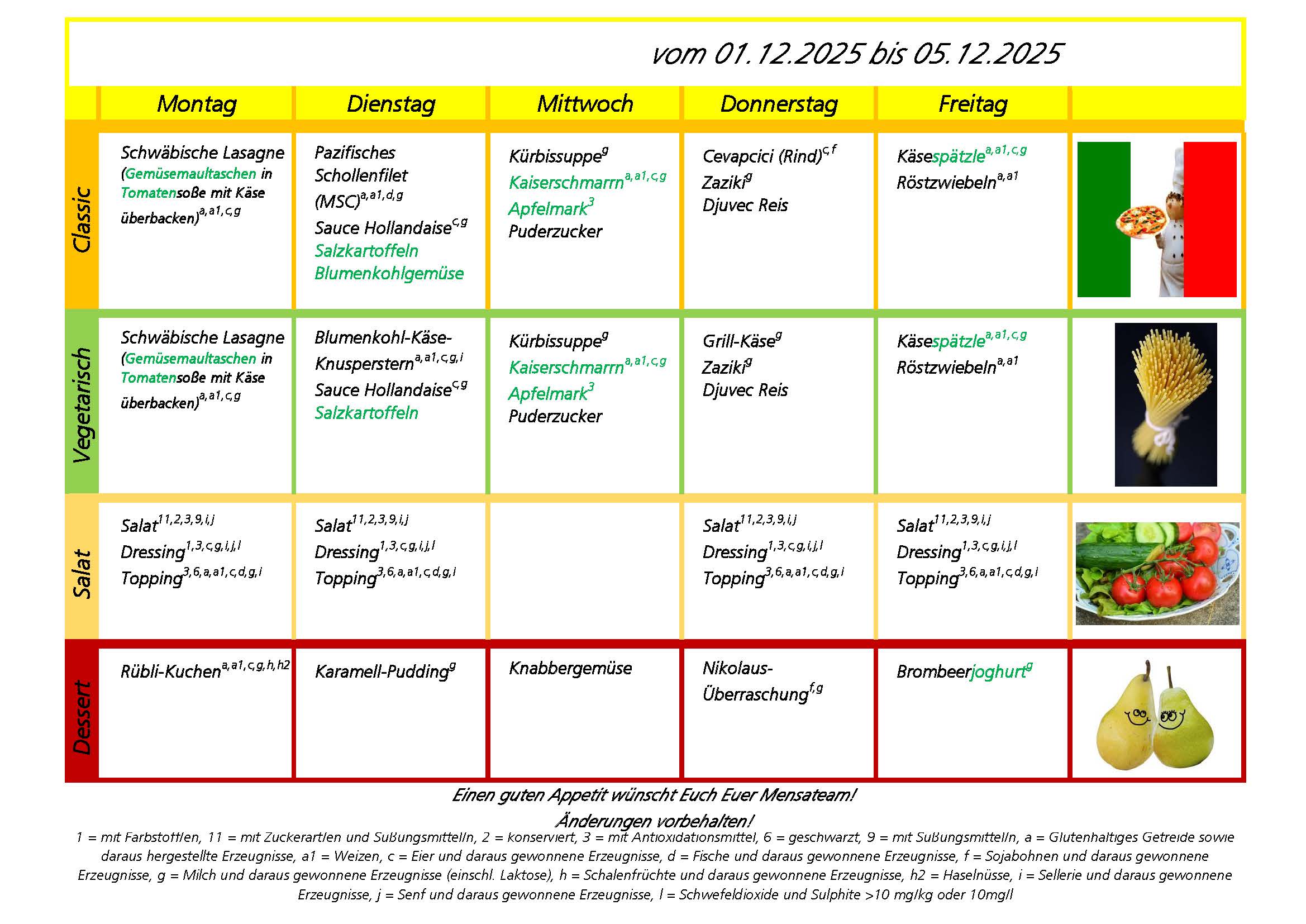 Speisepläne für die kommenden Wochen. Ein leerer Plan bedeutet, dass die Mensa ihre Menüs anhand der eigenen Vorräte selbst auswählt. Es gibt an den Tagen trotzdem Mittagessen, jedoch ohne Vorabinformation über die Menüs.