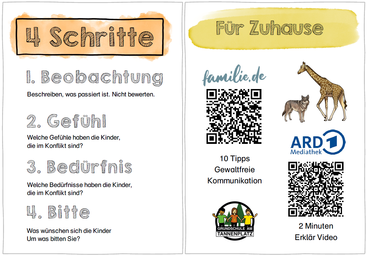 An unserer Schule fördern wir ein respektvolles und empathisches Miteinander. Damit sollen auftretende Konflikte konstruktiv und gewaltfrei gelöst werden. Wir integrieren die Grundsätze der Gewaltfreien Kommunikation nach Rosenberg in Form der Giraffensprache bereits ab Klasse 1 durchgehend. Das soziale Miteinander verzahnen wir eng mit der Demokratiebildung und Kinderbeteiligung. So lernen die Kinder im wöchentlich verbindlichen Klassenrat, ihre Anliegen selbstständig zu vertreten und Konflikte zunehmend eigenverantwortlich zu klären. Die schulweit verbindlichen gewählten Klassensprecher*innen vertreten die Interessen der Schülerschaft gegenüber den erwachsenen Personen der Schule. Ein regelmäßiger Rat aller Klassensprecher*innen wird aktuell aufgebaut. Darin berücksichtigen wir die Interessen der Kinder und ermöglichen ihnen, sich aktiv an der Gestaltung ihres Schulalltags im Ganztag zu beteiligen.