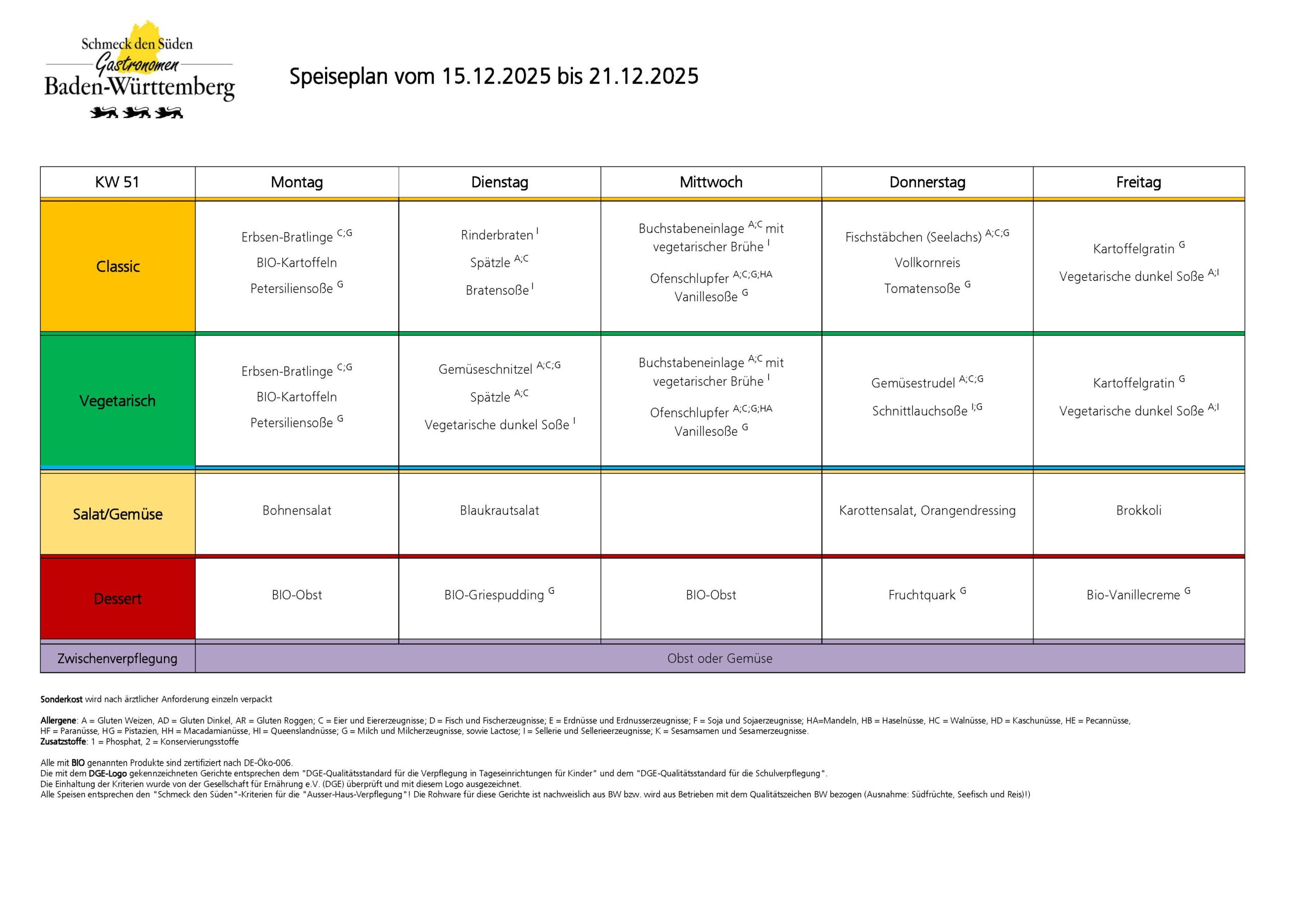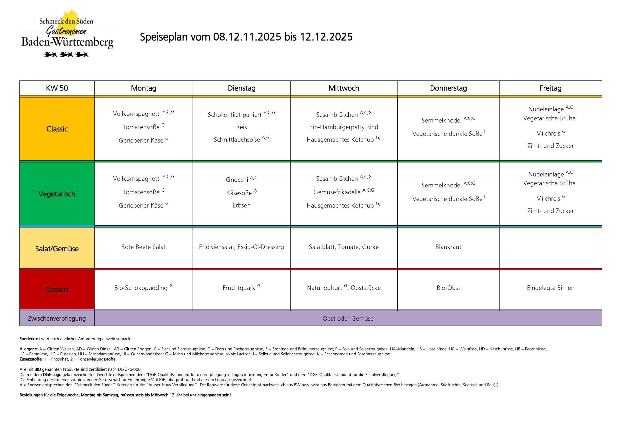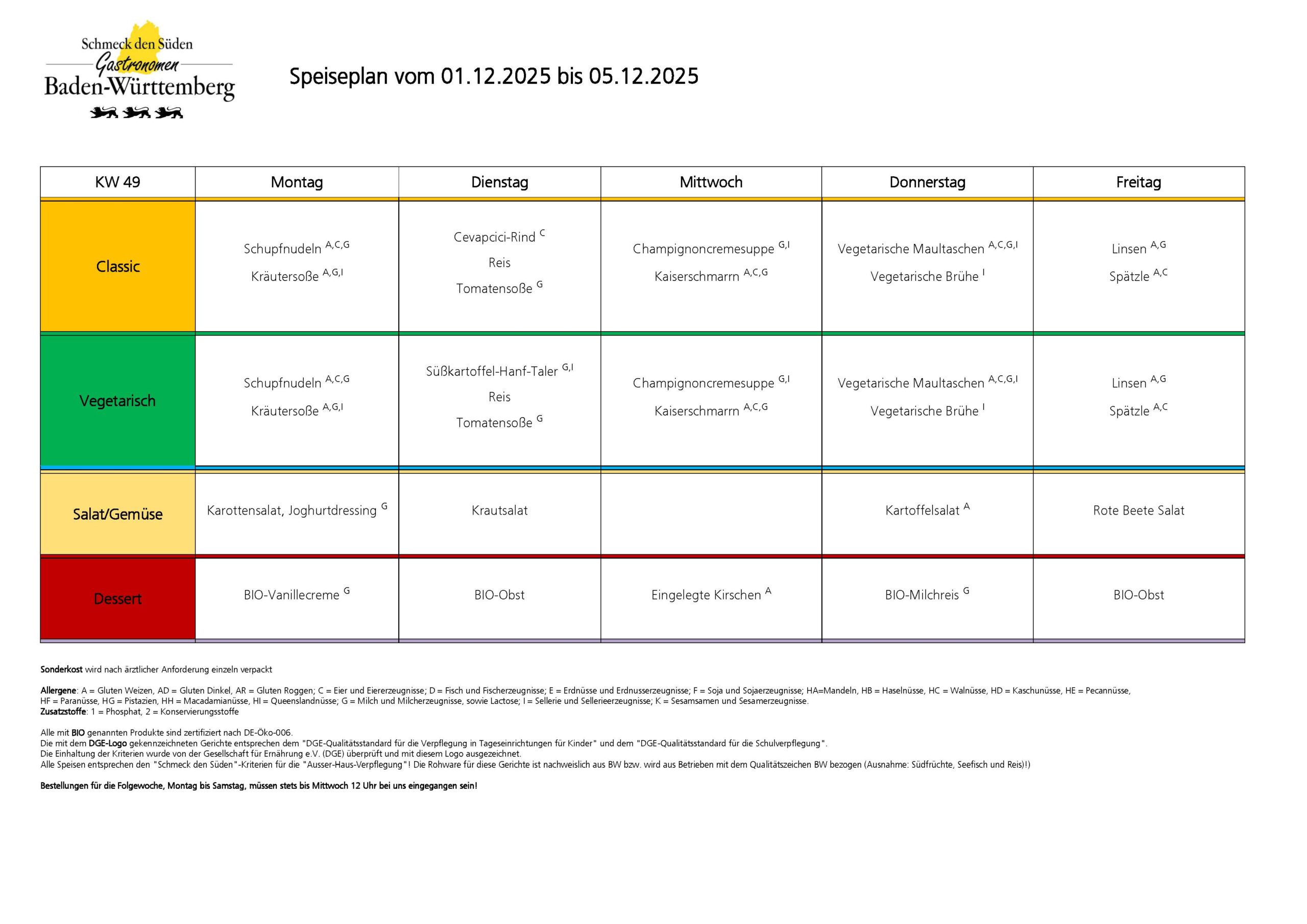 Speisepläne für die kommenden Wochen. Ein leerer Plan bedeutet, dass die Mensa ihre Menüs anhand der eigenen Vorräte selbst auswählt. Es gibt an den Tagen trotzdem Mittagessen, jedoch ohne Vorabinformation über die Menüs.