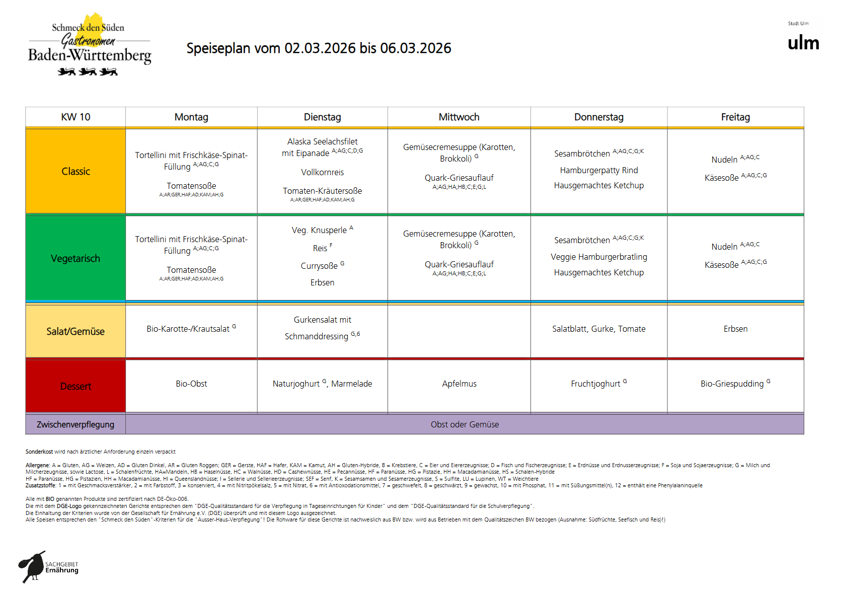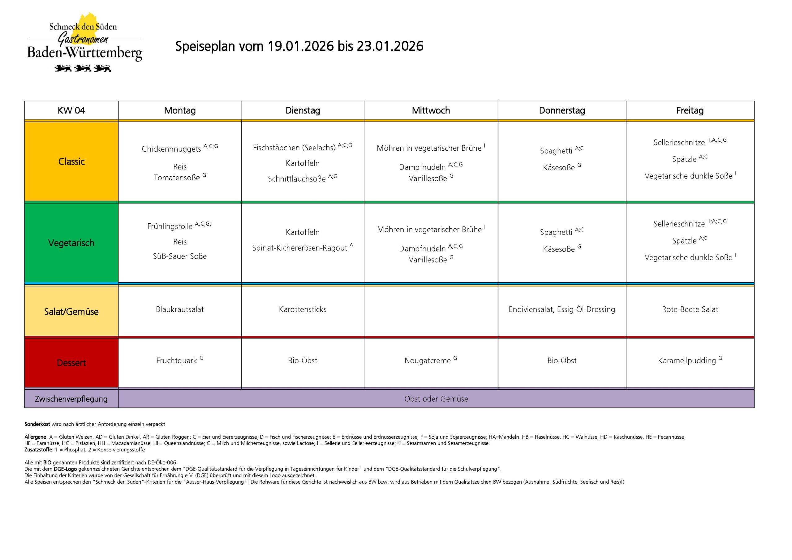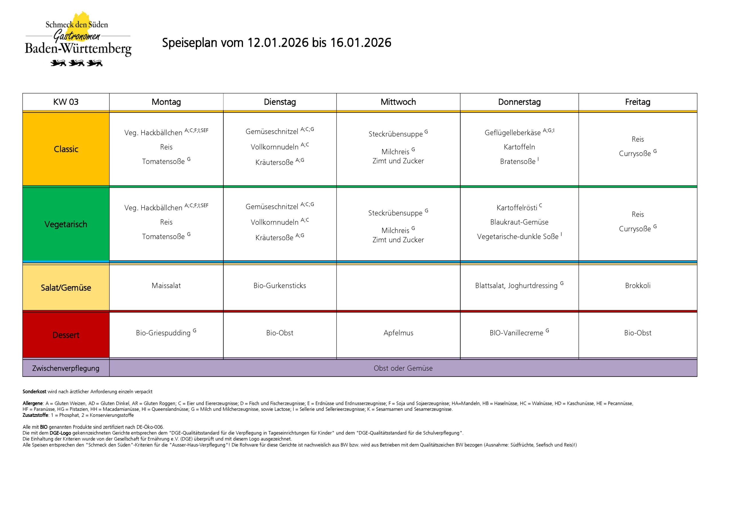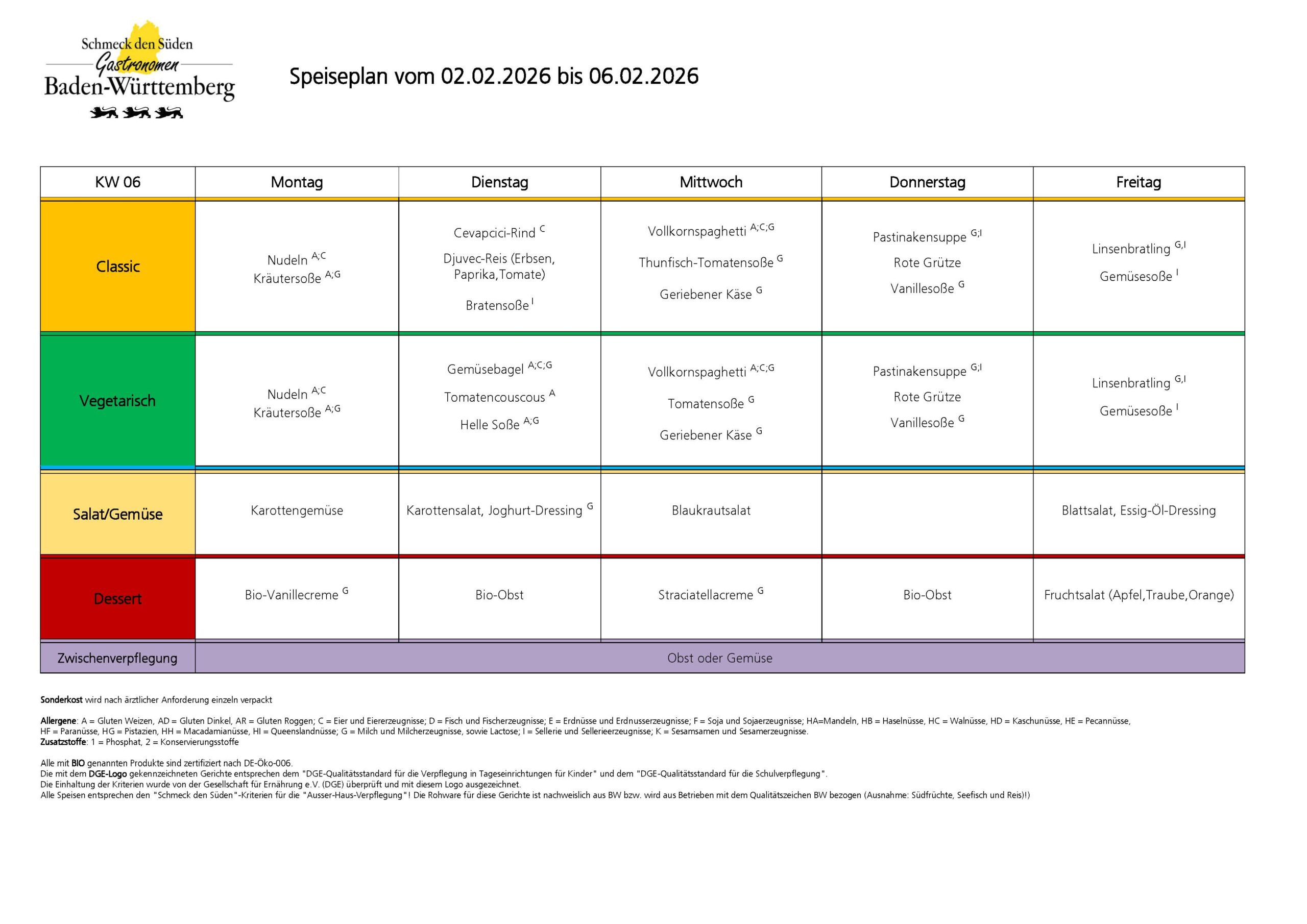 Alle Speisen entsprechen den „Schmeck den Süden“-Kriterien für die „Ausser-Haus-Verpflegung“! Die Rohware für diese Gerichte ist nachweislich aus BW bzw. wird aus Betrieben mit dem Qualitätszeichen BW bezogen (Ausnahme: Südfrüchte, Seefisch und Reis)!)